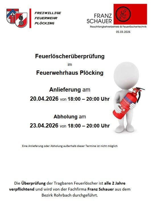 🔥 Feuerlöscherüberprüfung in Plöcking 🔥 Am 20.04.2026 (18:00–20:00 Uhr) können tragbare Feuerlöscher im Feuerwehrhaus Plöcking zur Überprüfung abgegeben werden. Die Abholung erfolgt am 23.04.2026 (18:00–20:00 Uhr). ❗ Bitte beachten: Eine Anlieferung oder Abholung außerhalb dieser Zeiten ist nicht möglich. Die gesetzlich vorgeschriebene Überprüfung (alle 2 Jahre) wird von der Fachfirma Franz Schauer aus dem Bezirk Rohrbach durchgeführt. 👉 Nutzt die Gelegenheit und sorgt für eure Sicherheit!